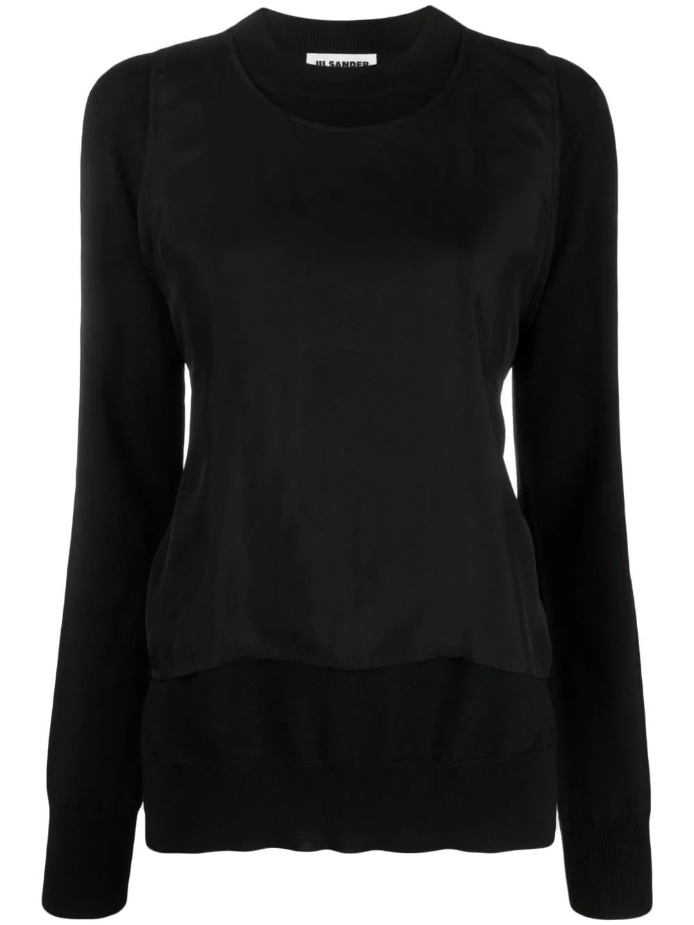 layered-design wool jumper Highlights - Jet black - Wool - Knitted construction - Layered design - Fine ribbed - Drop shoulder - Crew neck - Long sleeves - Straight hem Made in Italy Composition Wool 100%, Viscose 100% SIZE & FIT Model measurements Height 5 ft 10 in(1.78 m) Bust/Chest 30.7 in(78 cm) Hips 34.64 in(88 cm) Waist 23.22 in(59 cm) FittingInformation Designed for a relaxed fit, this piece allows for comfort and movement when worn The tie fastening gives an adaptable and personalised fit Made with a midweight knit, this piece offers some stretch This piece fits true to size – take your usual size