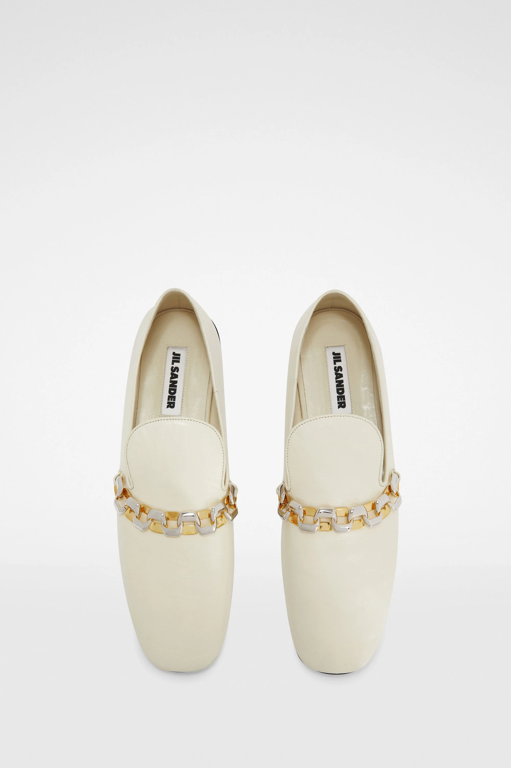 Leather flat loafer with two-toned hardware Details - round toe - two-toned knotted chain on the upper - nappa leather insole and lining - calf leather sole with rubber injection - Jil Sander logo branded insole - 100% goat leather - made in Italy - StyleID: J15WR0023P8226105