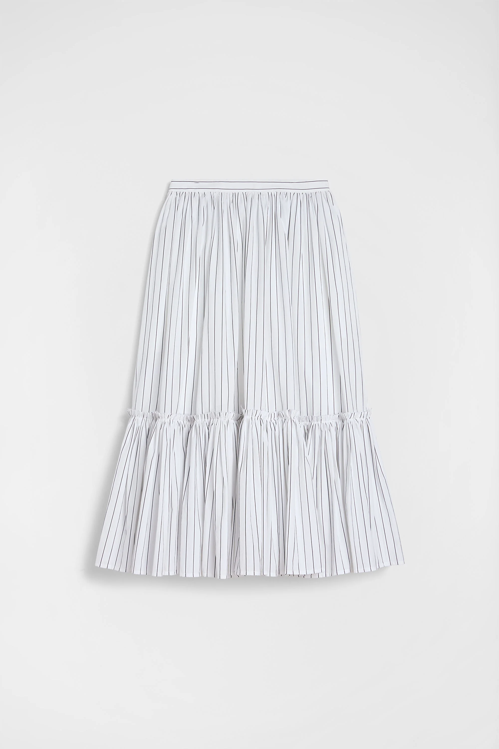 Striped lightweight cotton skirt with gathered waist and bottom ruffles Details - regular waist and calf-length - side zip closure - side-seam pockets - cotton lining - lightweight striped cotton - 100% cotton - made in Italy - StyleID: J02MA0373J45329154 Care - dry clean only - iron with care Fit - model is 177cm/5'9" and is wearing a size 34 DE - Please note that the physical label of the item will show the German size