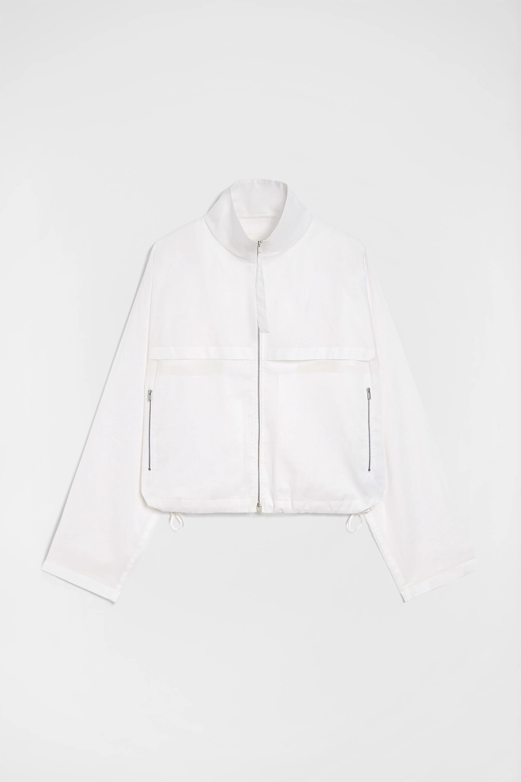 Lightweight cotton organdy muslin blouson with high neck and back floating carre Details - oversized fit and boxy shape - dropped shoulders - high neck - centre-front zip closure with graphic zip puller - side zipped pockets - drawstring hem - cotton organdy muslin - 100% cotton - made in Italy - StyleID: J01SW0009J45014100 Care - dry clean only - iron with care Fit - model is 177cm/5'9" and is wearing a size 34 DE - Please note that the physical label of the item will show the German size