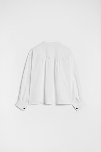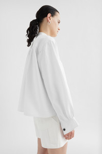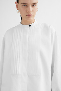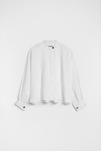 Long-sleeved linen shirt with front pleated plastron Details - relaxed fit and dropped shoulders - stand collar with single button closure - front closure with concealed buttons - voluminous gathered sleeves - 100% linen - made in Italy - StyleID: J04DL0106J60001100 Care - dry clean only - iron with care Fit - model is 177cm/5'9" and is wearing a size 34 DE - Please note that the physical label of the item will show the German size