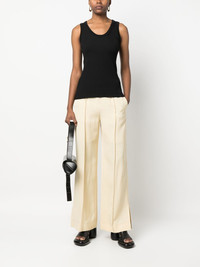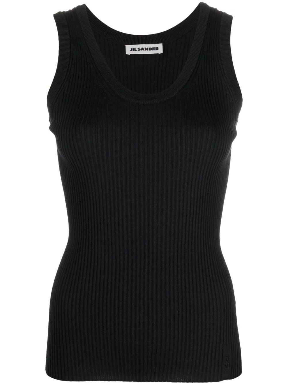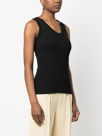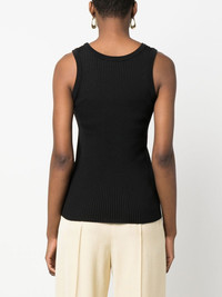 logo-embroidered ribbed top black wool-silk blend ribbed knit embroidered logo scoop neck sleeveless Made in Italy Composition Wool 70%, Silk 30% SIZE & FIT Model measurements Height 5 ft 11 in(1.8 m) Bust/Chest 31.49 in(80 cm) Hips 36.61 in(93 cm) Waist 24.4 in(62 cm) FittingInformation This piece fits true to size. We recommend you get your regular size Cut for a slim fit Made with a mid-weight fabric Washing instructions Dry Clean Only