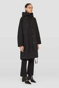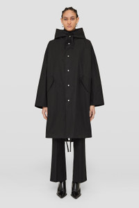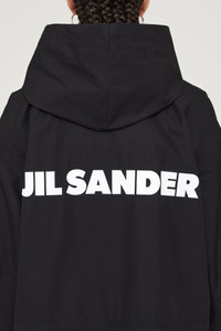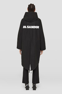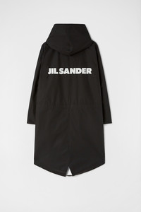 Mid-length cotton hooded parka with printed Jil Sander logo Details - oversized fit - snap button closure and drawstring waist - snap button closure - two flap pockets with reinforcement stitching detail - elasticated cuffs and dart detail on elbows - rounded hem with shorter front - printed Jil Sander logo on the back - water repellent cotton - 100% cotton - made in Italy - StyleID: J04AH0002J45046001 Care - dry clean only - iron with care Fit - model is 177cm/5'9" and is wearing a size 34 DE - Please note that the physical label of the item will show the German size