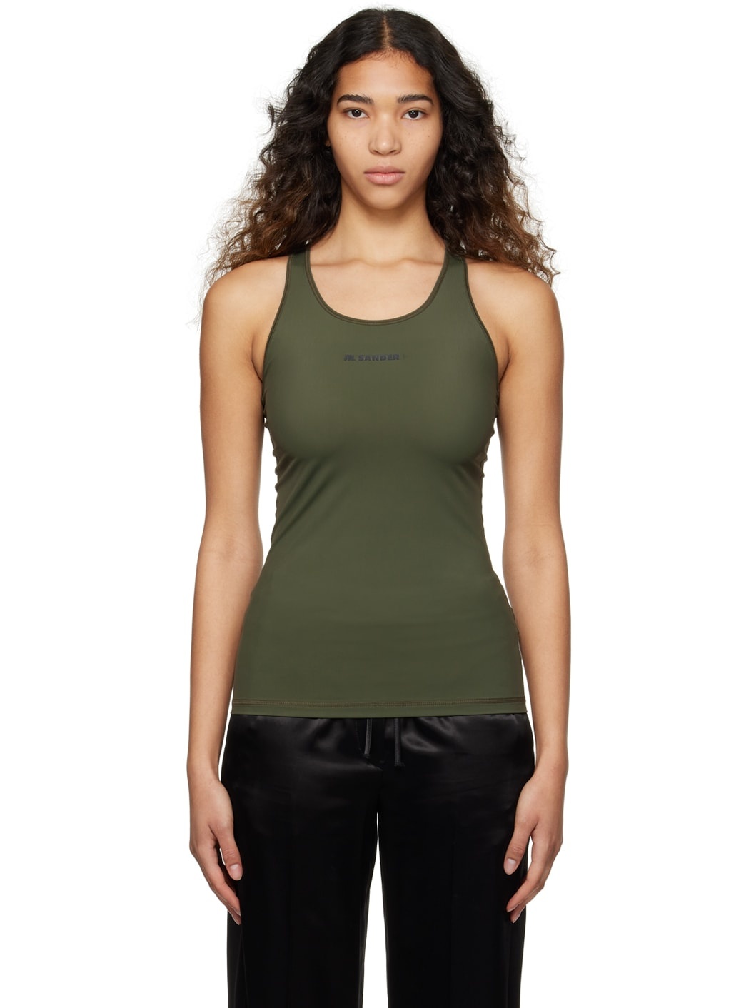 Stretch nylon jersey sport top. · Scoop neck · Logo printed at chest · Racer back Supplier color: Dark sage