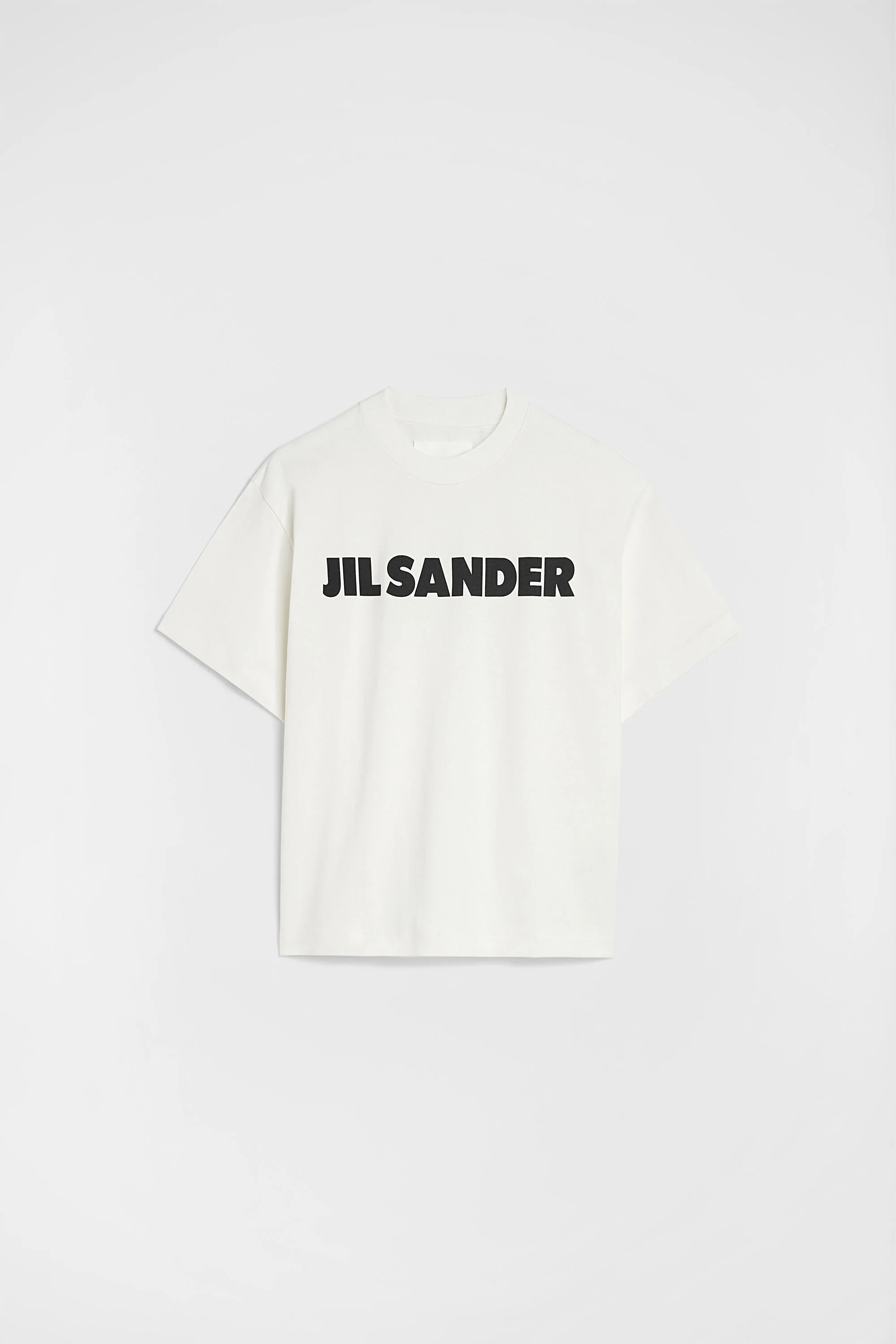 Stiff cotton jersey t-shirt with Jil Sander printed logo Details - oversized fit and boxy shape - dropped shoulders - short sleeves - ribbed crew neck - Jil Sander printed logo on front - thick, stiff cotton jersey - 100% cotton - made in Italy - StyleID: J02GC0001J45148102 Care - hand wash - iron with care Fit - model is 177cm/5'9" and is wearing a size 34 DE - Please note that the physical label of the item will show the international size