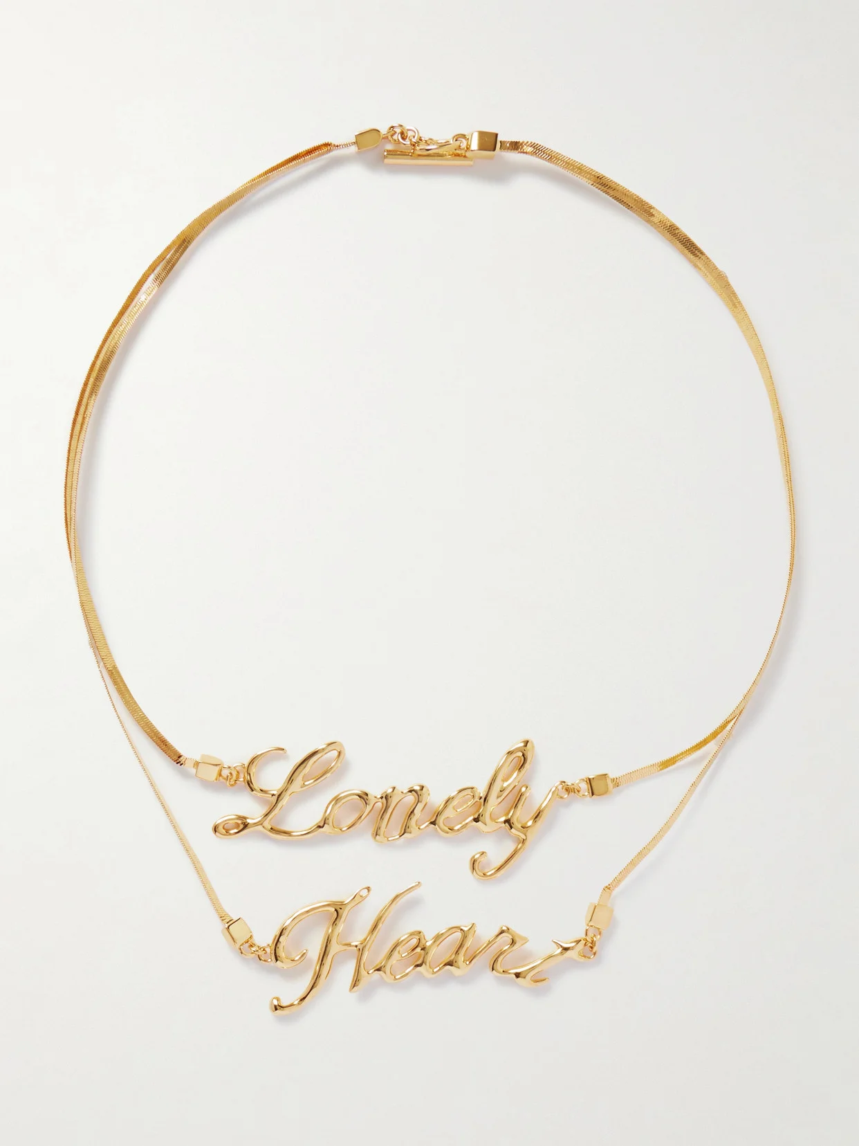 Jil Sander's necklace has the words 'Lonely' and 'Heart' strung on two slightly different chains, giving it a cool layered look. It's made from gold-tone brass and lays comfortably against your decolletage.