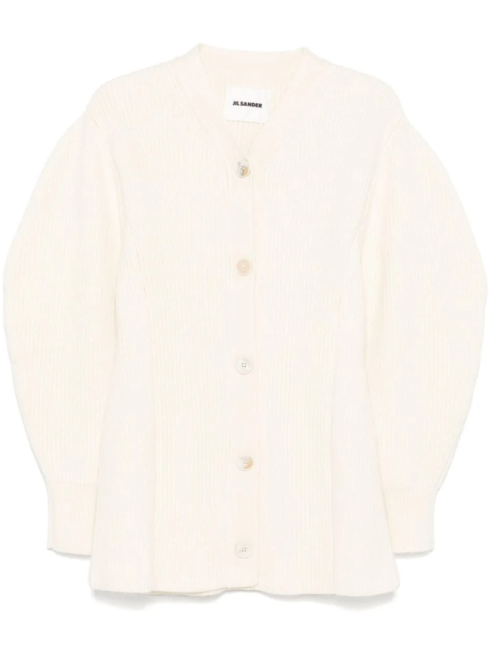 ribbed-knit cardigan Highlights - White - Wool - Ribbed knit - Front button fastening - Ribbed v-neck - Long puff sleeves - Ribbed cuffs Made in Italy Composition Wool 100% SIZE & FIT Model measurements Height 5 ft 9 in(1.75 m) Bust/Chest 30.7 in(78 cm) Hips 35.03 in(89 cm) Waist 23.62 in(60 cm) FittingInformation Designed for a slim fit that sits just away from the body offering a close yet comfortable fit Made with a heavyweight knit, this piece offers some stretch