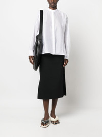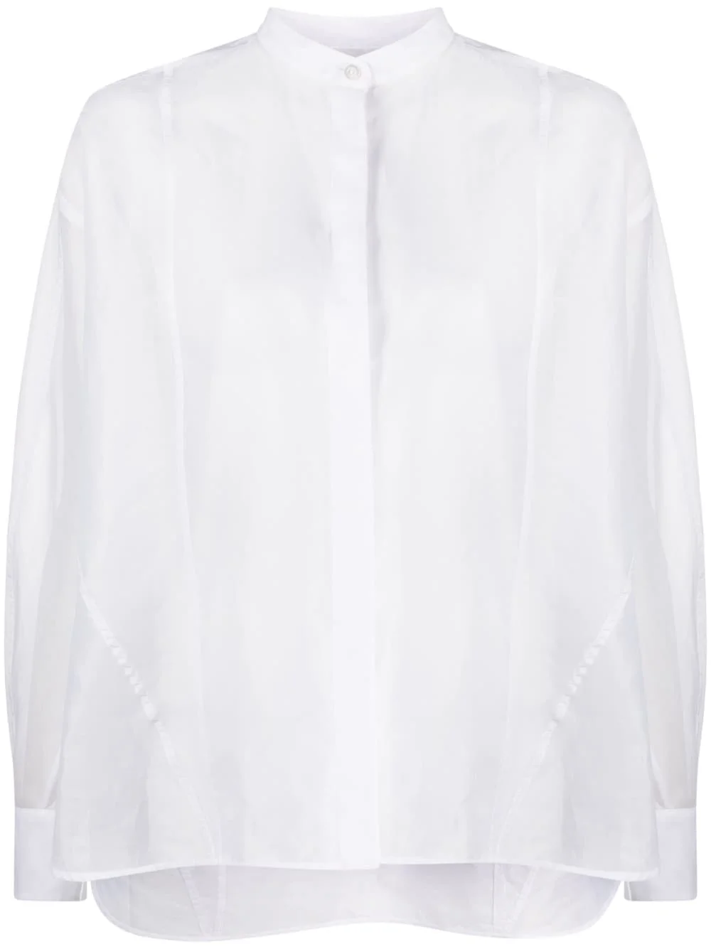 long-sleeve cotton shirt white cotton collarless concealed front button fastening long sleeves buttoned cuffs Made in Italy Composition Cotton 100% SIZE & FIT Model measurements Height 5 ft 10 in(1.77 m) Bust/Chest 32.28 in(82 cm) Hips 35.03 in(89 cm) Waist 25.19 in(64 cm) FittingInformation Designed to be unstructured, offering a loose fit throughout The detachable slip sits just away from the body, offering a close yet comfortable fit Made from a lightweight non-stretch fabric This piece fits true to size – take your usual size Washing instructions Dry Clean Only