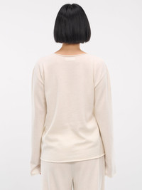 JIL SANDER sweater in off-white, paneled knit construction, wide neck, long sleeves, raw hems, straight hem, relaxed fit. Made in Italy French Sizing Model is 5'9" wearing size 36. Bust: 30" Waist: 23" Hips: 35"