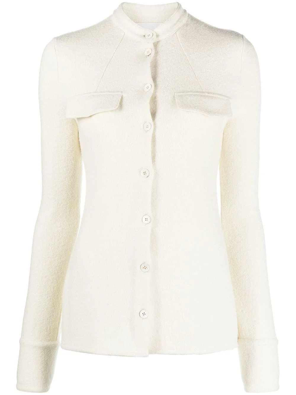 long-sleeve shirt Jil Sander is known for its sophisticated aesthetic. True to the label's approach, this long-sleeve shirt encompasses a minimalist style. Crafted from a soft wool blend, this design is subtly detailed with flap pockets and a collarless silhouette for a refined finish. Made in Italy Composition Wool 64%, Viscose 33%, Spandex/Elastane 3% SIZE & FIT Model measurements Height 5 ft 10 in(1.77 m) Bust/Chest 31.49 in(80 cm) Hips 33.85 in(86 cm) Waist 22.44 in(57 cm) FittingInformation This piece fits true to size. We recommend you get your regular size Cut for a slim fit Made with a mid-weight stretch fabric Washing instructions Hand Wash