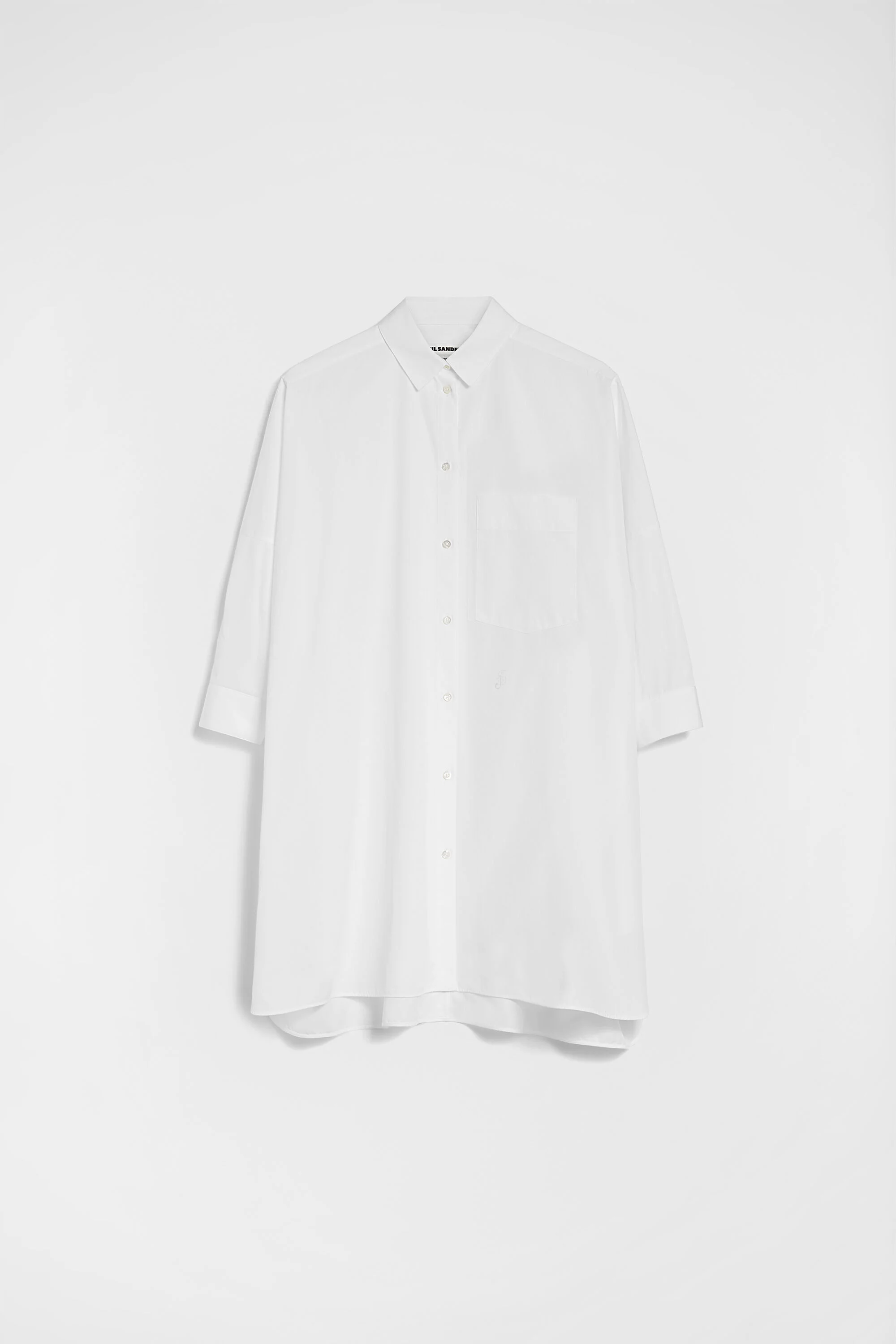 Long organic cotton poplin shirt with dropped shoulders and embroidered Jil Sander monogram Details - relaxed fit and boxy shape - dropped shoulder - large front patch pocket - side splits - classic collar and double cuffs - embroidered Jil Sander monogram - organic cotton poplin - 100% cotton - made in Italy - StyleID: J05DL0114J45001100 Care - dry clean only - iron with care Fit - model is 177cm/5'9" and is wearing a size 34 DE - Please note that the physical label of the item will show the German size
