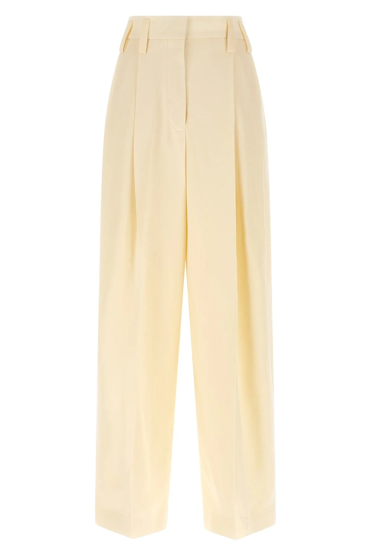 cod. J03KA0292J65005105 Silk and viscose fluid trousers, wide leg with front pleats, low crotch, slightly high waist, stretched pleat, zip and button closure, pockets. Color: White Size & Fit: true to size fit - GERMAN size Composition: 58% viscose, 42% silk Made in: Italy