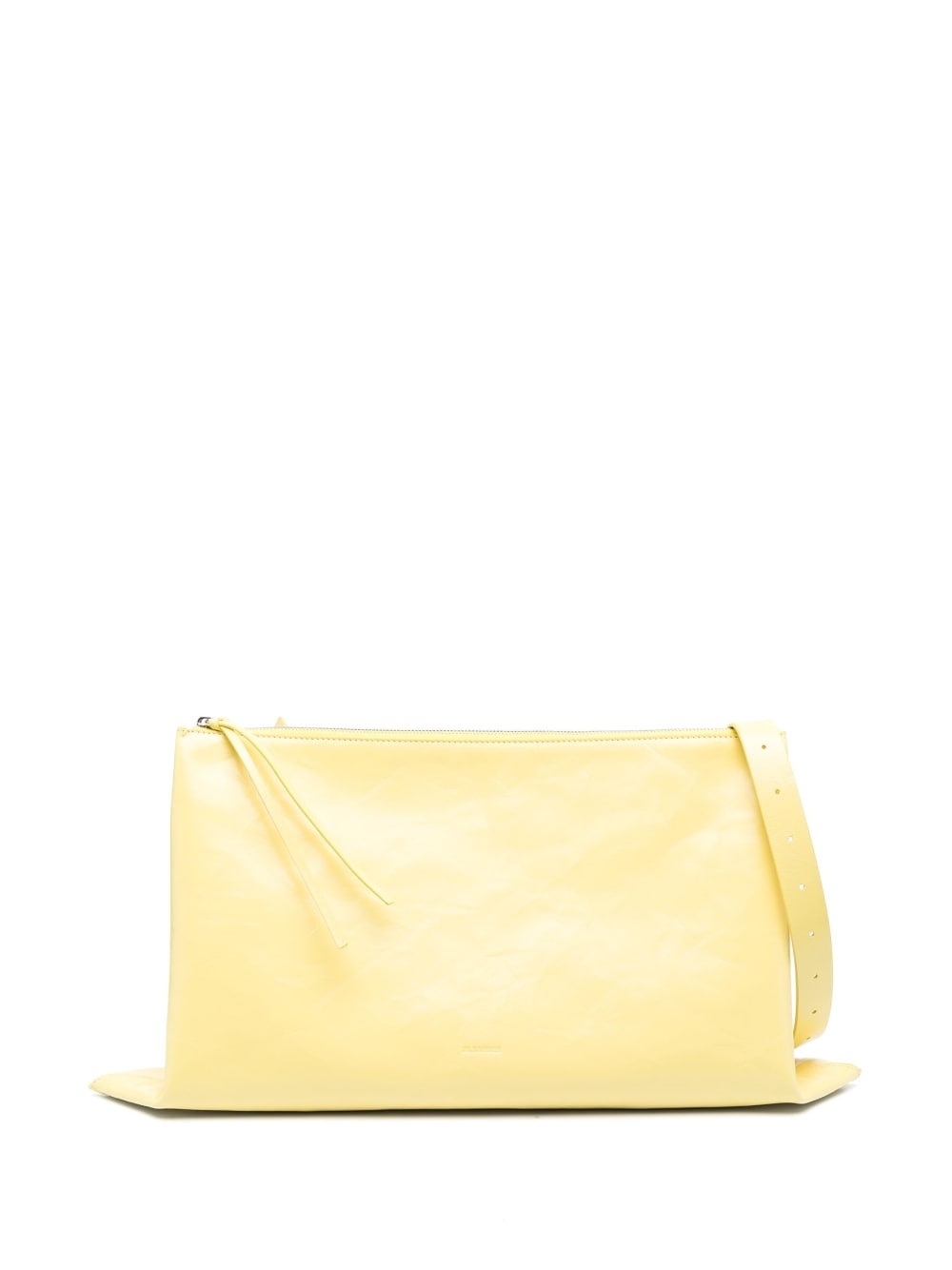 zip-up leather shoulder bag Crafted from leather, this shoulder bag by JIL SANDER is delivered in a pastel yellow hue for SS23. Its simple silhouette reflects the brand's penchant for minimalism, allowing for versatile styling. Highlights - Pastel yellow - Calf leather - Single shoulder strap - Main compartment - Top zip fastening Made in Italy Composition Outer: Calf Leather 100% SIZE & FIT Model measurements Height 5 ft 10 in(1.77 m) Bust/Chest 29.9 in(76 cm) Hips 32.7 in(83 cm) Waist 22.4 in(57 cm) Measurement DEPTH 5.1 in(13 cm) HEIGHT 9.8 in(25 cm) STRAP 22 in(56 cm) WIDTH 15.7 in(40 cm)