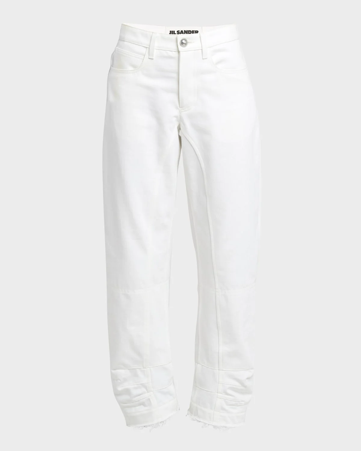Jil Sander denim trousers featuring paneling and a curved raw hem Mid rise sits high on hip Fivepocket style Straight legs Cropped at the ankle Button/zip fly; belt loops Cotton Made in Italy