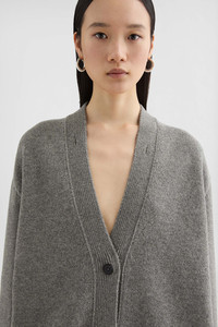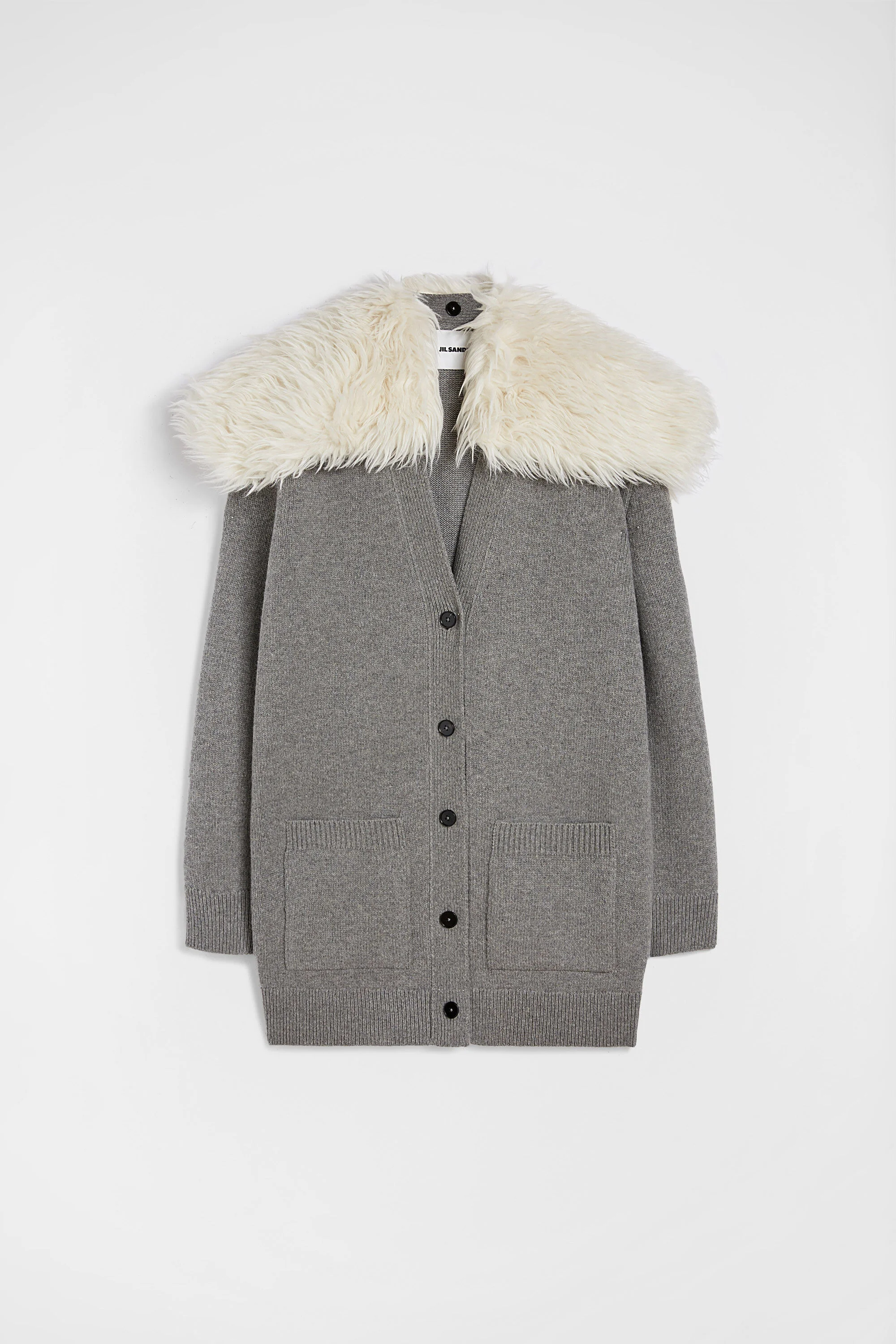 Long-sleeved merino and cashmere blend cardigan with detachable alpaca wool collar Details - oversized and long fit - dropped shoulders - v-neck with detachable alpaca wool collar - centre-front button closure - front patch pockets - ribbed neck, hem and cuffs - midweight structured lambswool and cashmere blend knit - knit fabric 81% virgin wool 11% cotton 5% cashmere 3% polyamide-nylon, detachable collar 87% alpaca 13% polyester - made in Italy - StyleID: J02HP0043J14512030 Care - dry clean only - iron with care Fit - model is 177cm/5'9" and is wearing a size 34 DE - Please note that the physical label of the item will show the German size