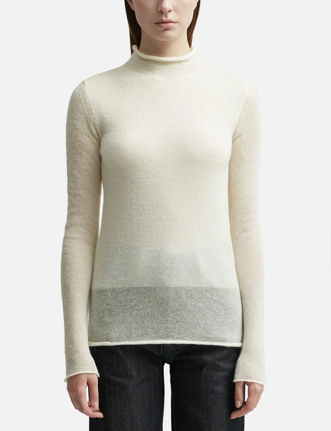 - Jil Sander - Mohair Blend Sweater - Loosely knitted mohair-polyamide blend exterior - Mock neck - Slightly sheer at bottom hem - Color: White - Material: 74% Mohair, 20% Polyamide, 6% Wool - See more Knitwear and Clothing SIZING - Model wears size 34 - Model measures: Height 181cm, Chest 33”/84cm, Waist 24”/61cm, Hip 35”/90cm