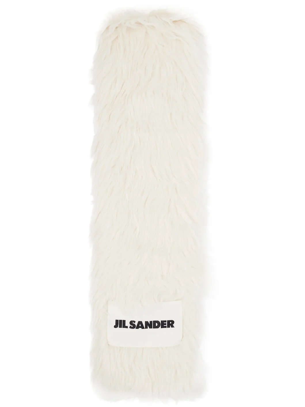 Rectangular shag-knit alpaca scarf. · Logo patch at face · Twill lining · L72" x W6" Supplier color: Latte Body: 100% alpaca. Lining: 100% polyester. Made in Italy 252249F062000