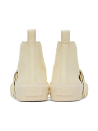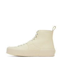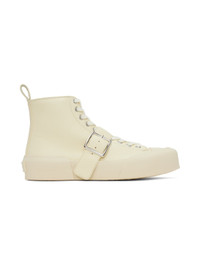 High-top grained nappa leather sneakers in off-white. · Rubber cap toe · Lace-up closure · Pin-buckle strap at vamp · Pull-loop at heel collar · Logo patch at padded leather footbed · Grained nappa leather lining · Rubberized logo patch at heel counter · Textured rubber sole Supplier color: Toile Upper: leather. Sole: rubber. Made in Spain 231249F127006