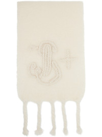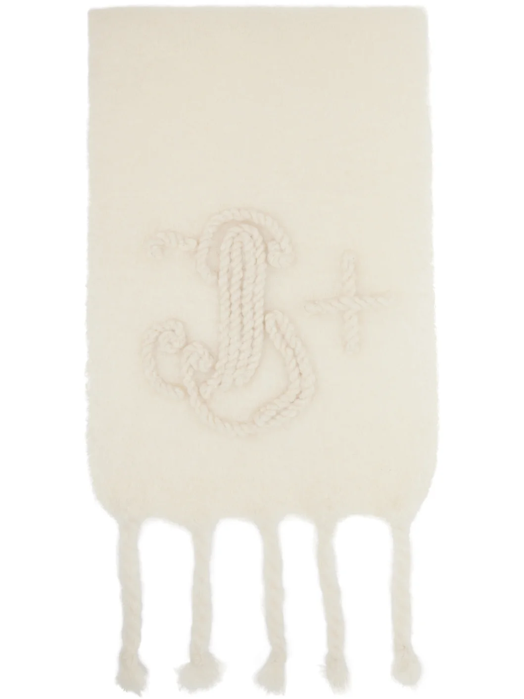 Rectangular hand-knit mohair- and wool-blend scarf. · Braided logo applique at face · Fringed detailing at ends · L86" x W16.5" Supplier color: White 73% mohair, 24% wool, 3% polyamide. Made in Spain 252249F028004
