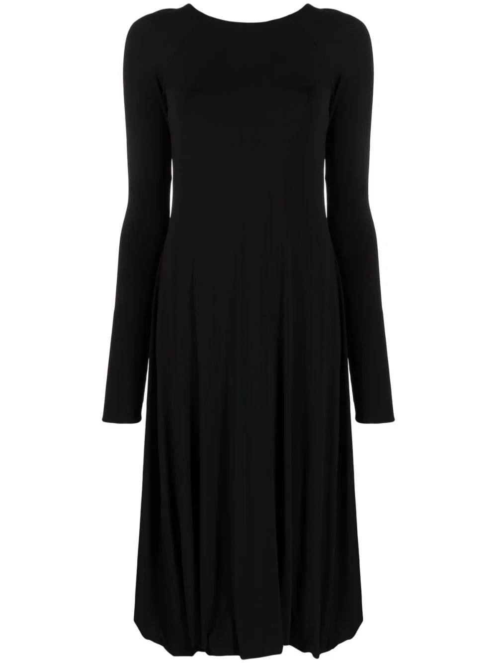 open-back midi dress Cut for a slightly flared silhouette, this dress encapsulates Jil Sander's minimalist essence. The mid-length design arrives in black and is further enhanced with an open back and know-detailing at the rear strap. Highlights - Black - Open back - Knot detailing - Open back - Round neck - Long sleeves - Mid-calf length Made in Italy Composition Viscose 94%, Elastane 6% SIZE & FIT Model measurements Height 5 ft 9 in(1.75 m) Bust/Chest 31.49 in(80 cm) Hips 34.05 in(86.5 cm) Waist 24.21 in(61.5 cm) FittingInformation Designed for a close fit at the chest and waist with a loose fit at the hip Made from a midweight stretch fabric, this piece offers elasticity and flexibility when worn This piece fits true to size – take your usual size Washing instructions Dry Clean Only