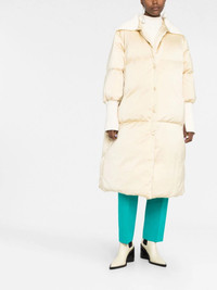 padded contrast coat cream white feather down padded design contrasting collar snap-fit fastening ribbed cuffs high-cuffs Made in Italy Composition Lining: Feather Down 100%, Polyester 100% Outer: Polyamide 100%, Polyester 100% SIZE & FIT Model measurements Height 5 ft 11 in(1.8 m) Bust/Chest 31.49 in(80 cm) Hips 36.61 in(93 cm) Waist 24.4 in(62 cm) FittingInformation This piece fits true to size. We recommend you get your regular size Cut for a loose fit Made with a mid-weight non-stretch fabric Washing instructions Dry Clean Only