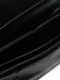 padded leather shoulder bag This black Jil Sander shoulder bag is crafted from supple leather with a malleable handle that’s especially suited to the fold-over top and slouchy silhouette. A petit gold-tone logo adorns the front. Highlights - Black - Calf leather - Smooth grain - Padded design - Gold-tone debossed logo to the front - Adjustable shoulder strap with gold-tone circular buckle - Partitioned compartment - Internal slip pocket - Debossed internal logo - Foldover top with concealed magnetic fastening - This piece comes complete with a protective dust bag. Made in Italy Composition Outer: Calf Leather 100% Lining: Calf Leather 100% SIZE & FIT Measurement DEPTH 3.54 in(9 cm) HEIGHT 5.9 in(15 cm) STRAP 14.17 in(36 cm) WIDTH 12.2 in(31 cm)