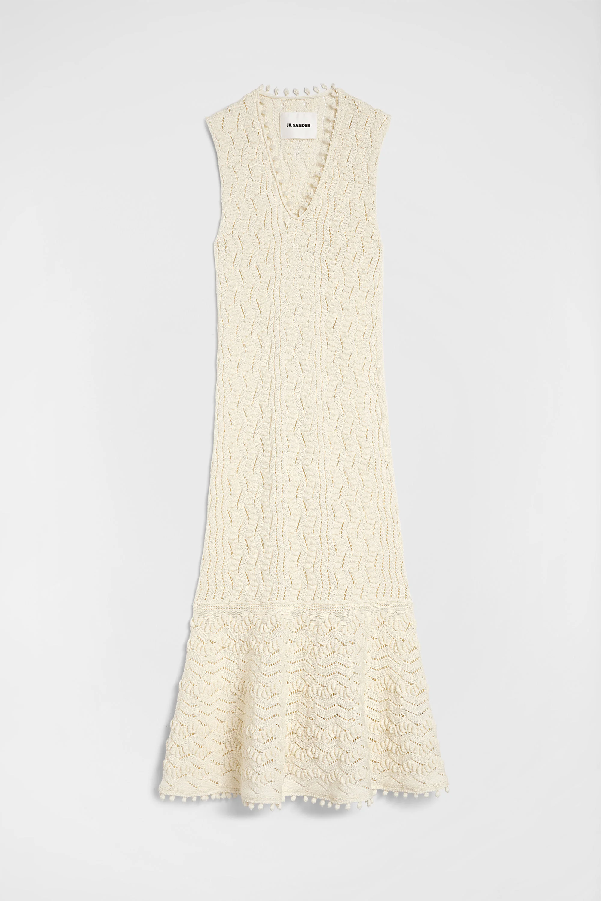 Sleeveless textured cotton dress with neck and hem passementerie Details - regular fit and ankle length - v-neck - godet bottom - fine-knit cotton in popcorn stitch - 100% cotton - made in Italy - StyleID: J02CT0560J15476106 Care - dry clean only - iron with care Fit - model is 177cm/5'9" and is wearing a size 34 DE - Please note that the physical label of the item will show the German size
