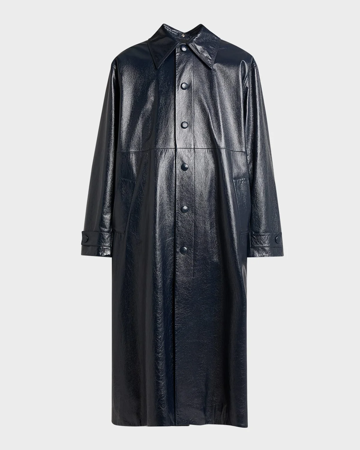 Jil Sander trench coat in patent deer leather Point collar; snap front Long sleeves; snaptab cuffs Side welt pockets Rainshield back Straight legs Full length Centerback vented hem Leather Made in Italy