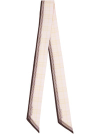Silk twill skinny scarf. · Check pattern throughout · Stripes at length · Logo printed at ends · L46" x W2.25" Supplier color: Pink check 100% silk. Made in Italy 261249F029003
