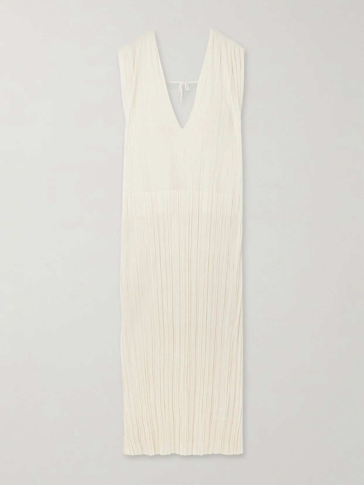 Jil Sander's Spring '24 collection is a lesson in modern elegance. This maxi dress is made from textural silk-plisse in a loose shape with a plunging neckline. Wear it with statement jewelry and strappy sandals.