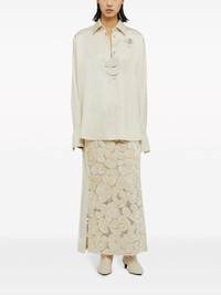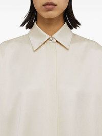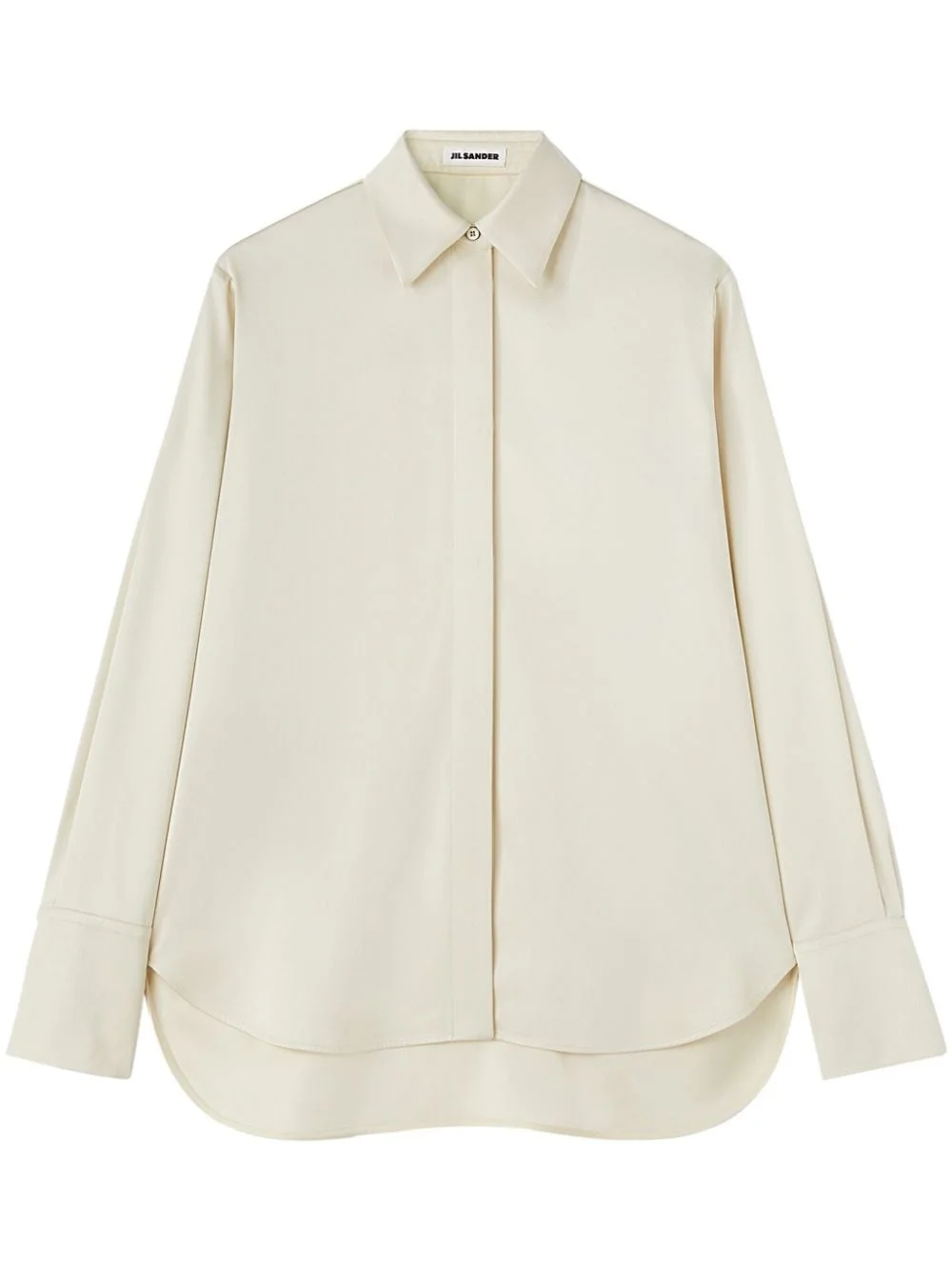 pointed-collar satin shirt Highlights - Light beige - Satin finish - Pointed flat collar - Concealed front button fastening - Long sleeves - Buttoned cuffs - High-low hem - Curved hem Made in Italy Composition Viscose 83%, Silk 17% SIZE & FIT FittingInformation Designed for a relaxed fit, this piece allows for comfort and movement when worn This piece fits true to size – take your usual size Washing instructions Read Manufacturer Guidelines