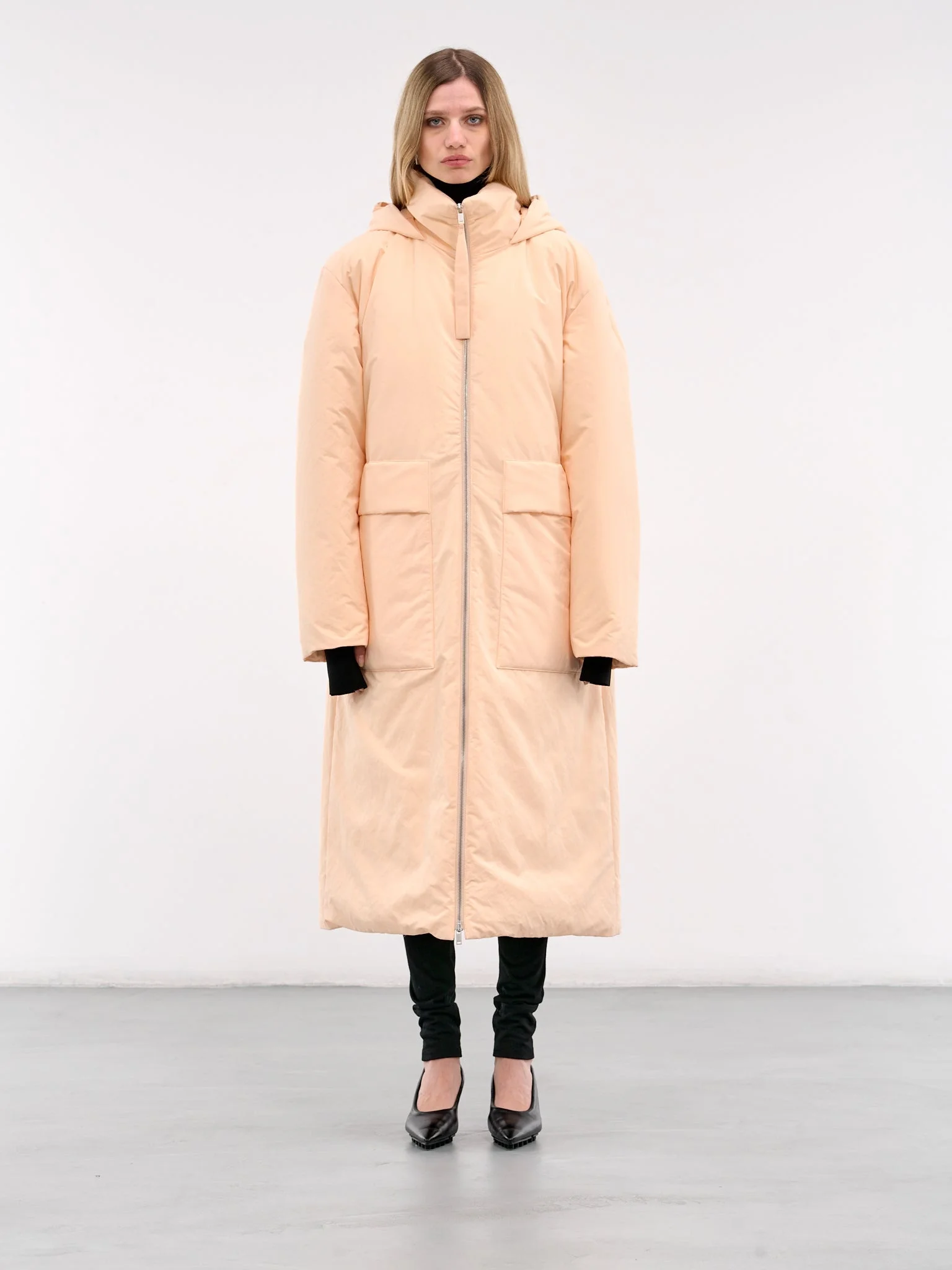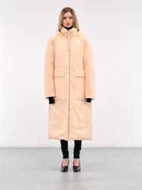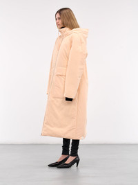 JIL SANDER coat in peach, paneled construction, high neck, hood, front exposed two-way zip closure, long sleeves, side flap pockets, straight hem, relaxed fit. Made in Italy Standard Sizing Model is 5'9" wearing size S. Bust: 32" Waist: 23" Hips: 34"