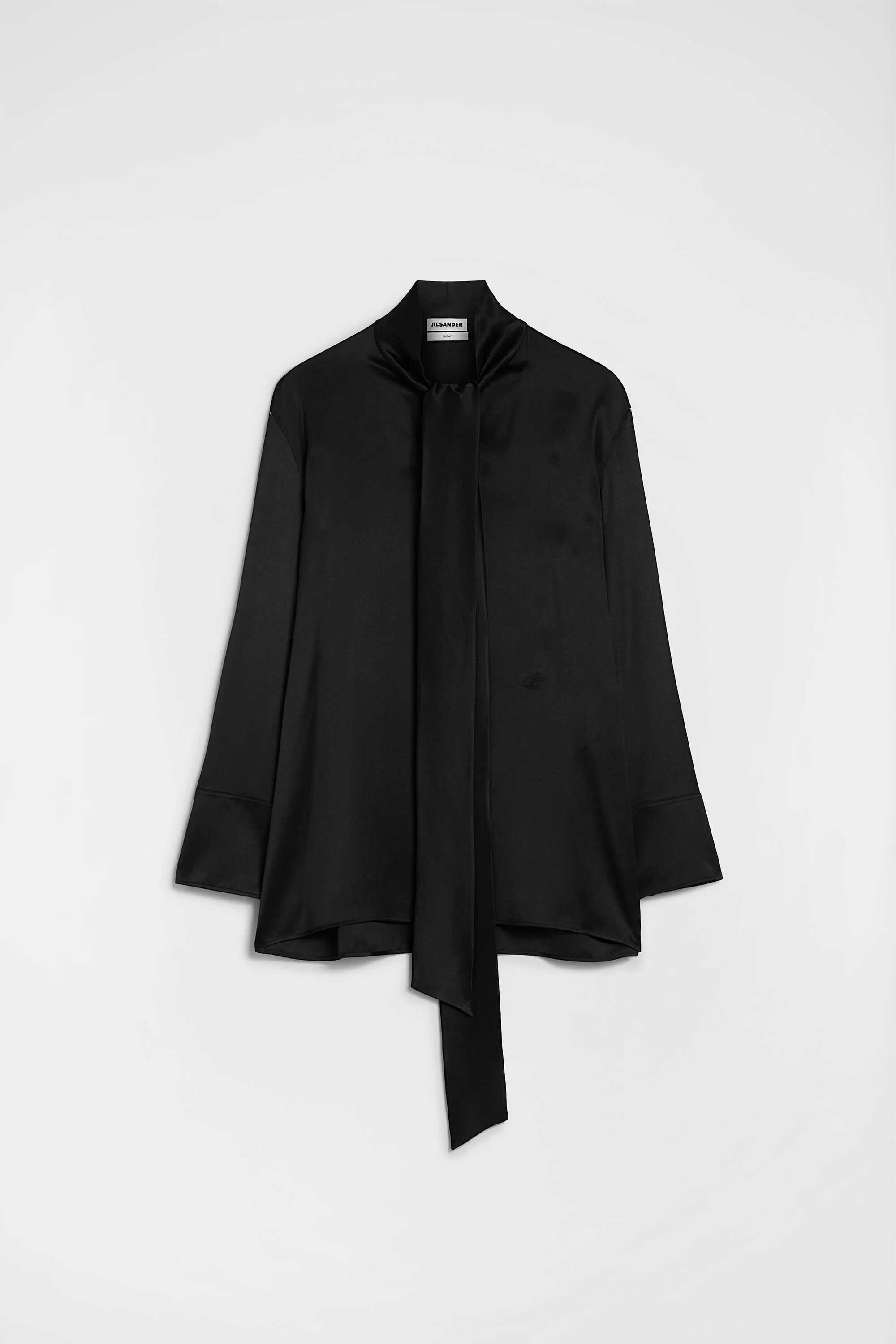 Long-sleeved silk shirt with scarf tie neck and embroidered Jil Sander monogram Details - relaxed fit and boxy shape - front opening with scarf tie neck - double cuffs - side-seam splits - embroidered Jil Sander monogram - fluid drape satin - 100% silk - made in Italy - StyleID: J05DL0012J55005001 Care - dry clean only - iron with care Fit - model is 177cm/5'9" and is wearing a size 34 DE - Please note that the physical label of the item will show the German size