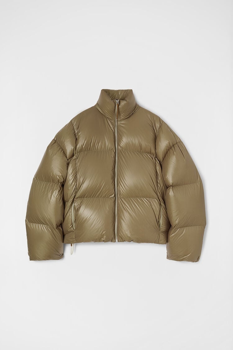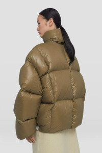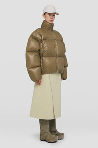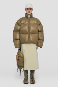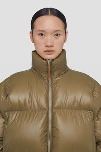 Recycled nylon heavy fill down jacket Details - oversized fit and boxy shape - stand collar with hidden internal hood - front zip closure - front pockets with zip closure and inner patch pocket - drawstring hem - Jil Sander+ logo printed on back label - packaway bag included - quilted lightweight recycled nylon with a shiny finish - 100% polyamide-nylon, padding 85% goose down 15% goose feather - made in Italy - StyleID: J40AF0161J70007218 Care - dry clean only Fit - model is 177cm/5'9" and is wearing a size M - Please note that the physical label of the item will show the international size
