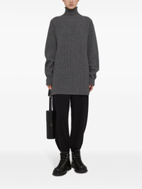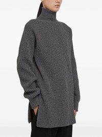 grey wool ribbed knit high neck drop shoulder long sleeves straight hem Size & Fit Model Measurements: Bust: 0cm Height: 0cm Hips: 0cm Waist: 0cm Fabric and Care Designer Style ID: J40GP0165J14737 Designer Colour: 038 GREY Composition: Wool 100% Washing instructions: Read Manufacturer Guidelines Made in Italy