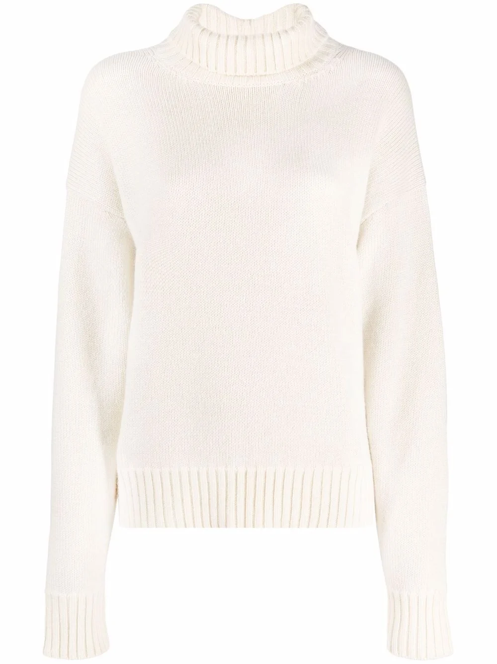 roll neck knitted jumper off-white cashmere-blend roll neck fine knit long sleeves ribbed hem Made in Italy Composition Cashmere 95%, Polyester 5% SIZE & FIT Model measurements Height 5 ft 10 in(1.78 m) Bust/Chest 31.1 in(79 cm) Hips 33.85 in(86 cm) Waist 24.01 in(61 cm) FittingInformation Designed to be unstructured, offering a loose fit throughout Made with a midweight knit, this piece offers some stretch This piece fits true to size – take your usual size Washing instructions Dry Clean Only