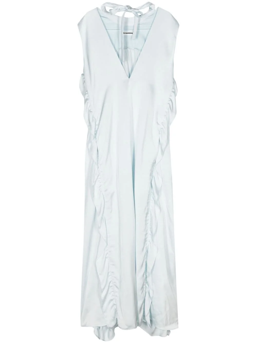 ruffle-trim satin maxi dress Highlights - Sky blue - Satin finish - Ruched detailing - Ruffled trim - Plunging v-neck - Neck tie fastening - Sleeveless - Straight hem - Ankle-length - Unlined Made in Italy Composition Outer: Viscose 100% Lining: Viscose 100% SIZE & FIT FittingInformation Designed to be unstructured, offering a loose fit throughout Washing instructions Dry Clean Only