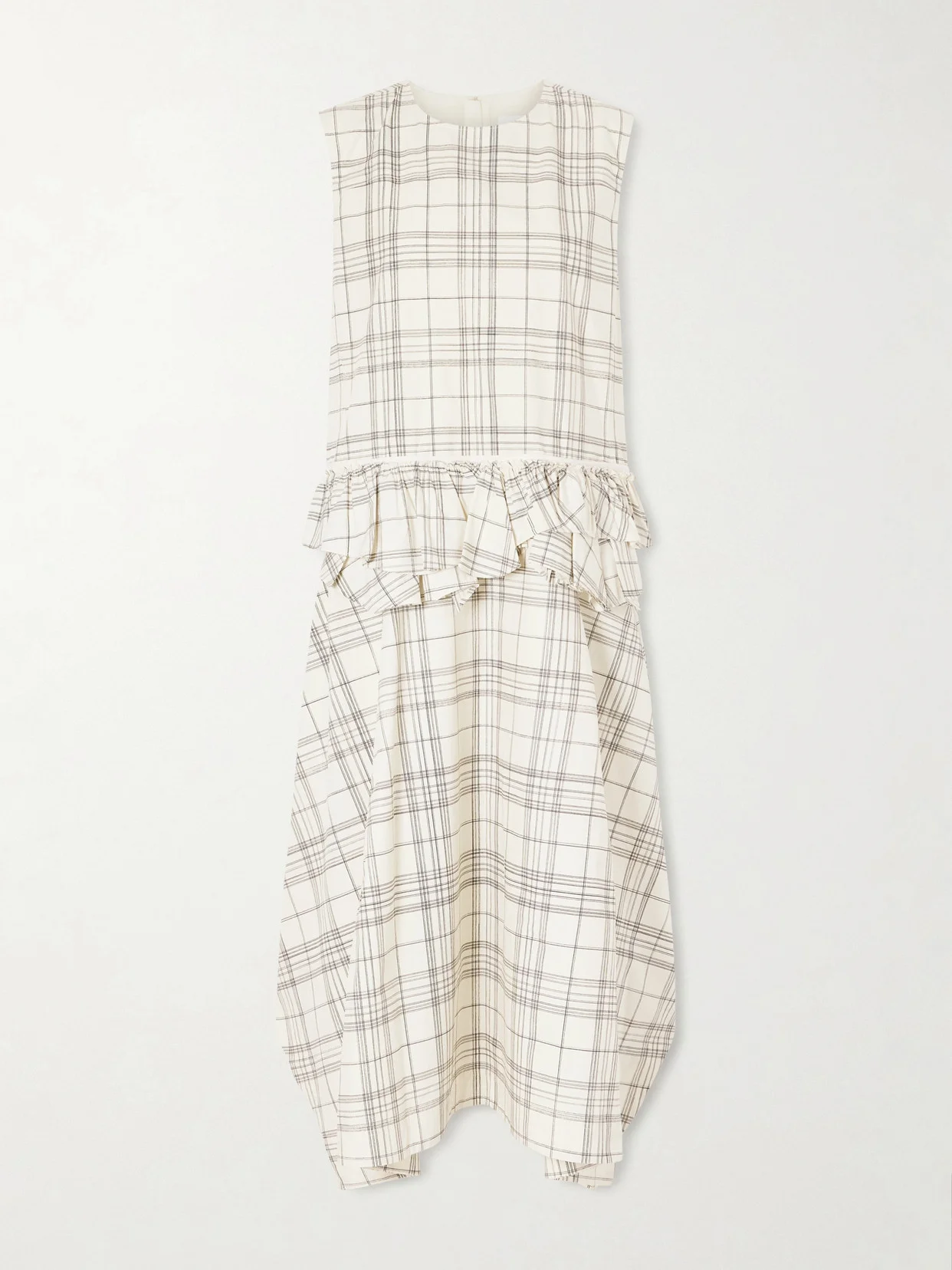 Jil Sander is celebrated for its understated yet modern approach. This midi dress is made from checked cotton-poplin with flouncy ruffled trims at the waist and an asymmetric hem.