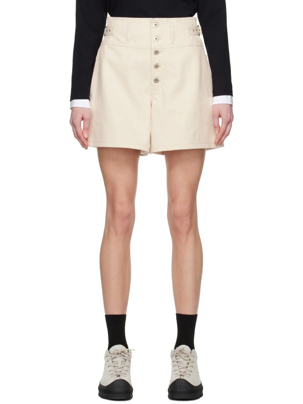 Non-stretch selvedge denim shorts. · Belt loops · Adjustable pin-buckle straps at waistband · Four-pocket styling · Exposed button-fly Supplier color: Natural Body: 100% cotton. Lining: 100% cotton. Made in Japan 241249F088004
