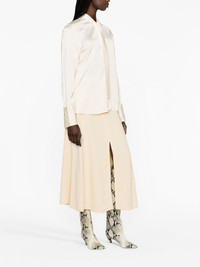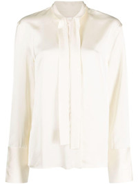 satin-finish tie-neck blouse Defined by a refined satin finish that offers sheen and fluidity to its tonal design, this cream-hued blouse from Jil Sander is cut to a relaxed silhouette and fitted with buttoned cuffs. The design can be adjusted at the neck with self-tie ribbons. Highlights - Cream white - Satin finish - Gathered tie neck - Long sleeves - Buttoned cuffs - Straight hem Made in Italy Composition Viscose 100% SIZE & FIT Model measurements Height 5 ft 11 in(1.8 m) Bust/Chest 34.25 in(87 cm) Hips 35.82 in(91 cm) Waist 24.8 in(63 cm) FittingInformation Designed to be unstructured, offering a loose fit throughout Made from a lightweight non-stretch fabric This piece fits true to size – take your usual size Washing instructions Dry Clean Only