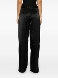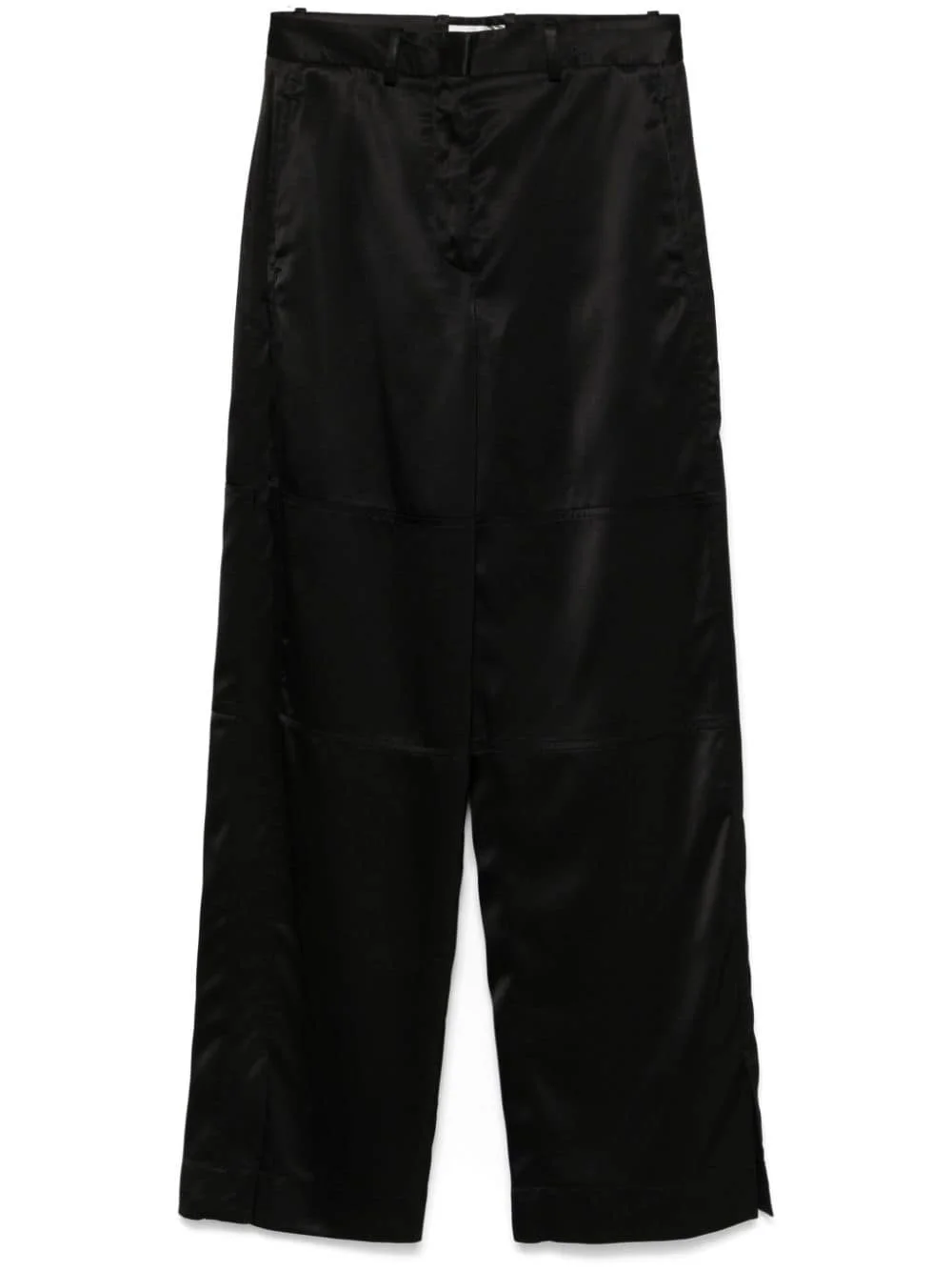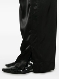 satin trousers Highlights - Black - Satin weave - Panelled design - Concealed front button, hook and zip fastening - Belt loops - Two side inset pockets - Side slits - Two rear welt pockets - Full-length - Straight leg Made in Italy Composition Lining: Viscose 100% Outer: Viscose 100% SIZE & FIT Model measurements Height 5 ft 11 in(1.8 m) Bust/Chest 33.07 in(84 cm) Hips 37.4 in(95 cm) Waist 25.19 in(64 cm) FittingInformation Designed with a wide-leg cut, these trousers allow for a close fit at the waist and offer a loose and roomy fit over the leg Made from a midweight non-stretch fabric