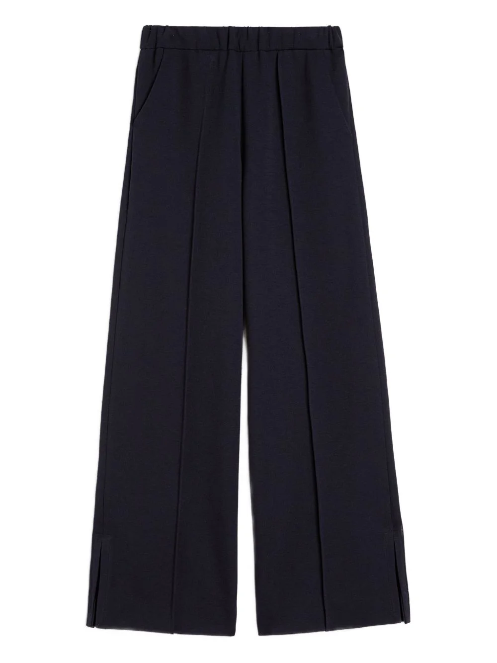 elastic-waist trousers Highlights - Dark blue - Elastic waistband - Side-seam pockets - Hand-embroidered monogram - Wide leg - Side slits Made in Italy Composition Polyester 68%, Cotton 29%, Elastane 3%, Spandex/Elastane 3% Washing instructions Read Manufacturer Guidelines