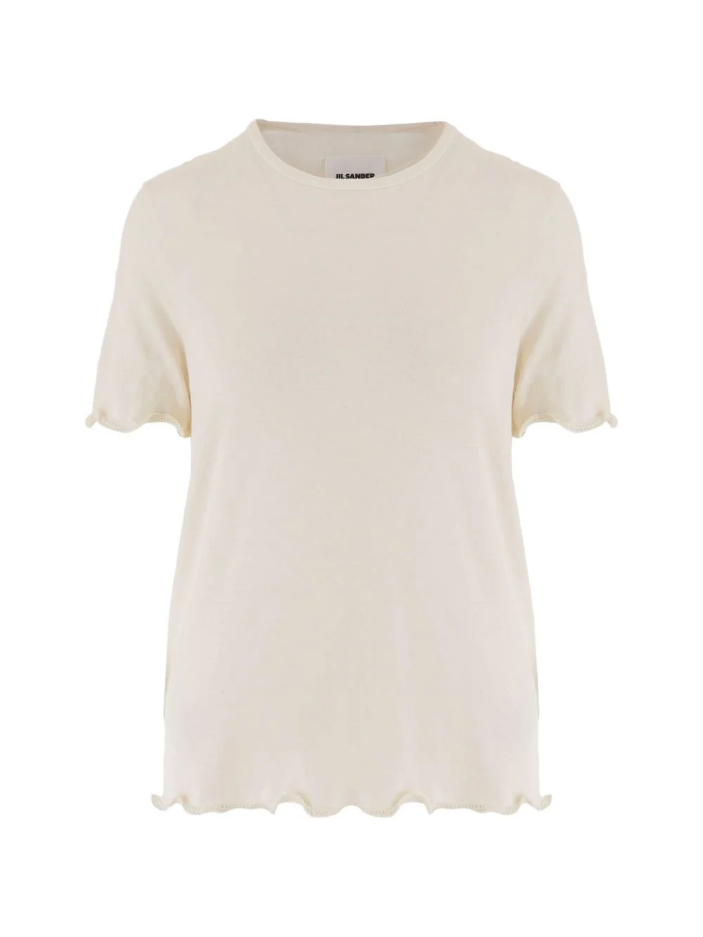 scalloped-trims T-shirt Highlights - Beige - Crew neck - Short sleeves - Scalloped trims Made in Italy Composition Silk 76%, Linen/Flax 18%, Spandex/Elastane 6% Washing instructions Read Manufacturer Guidelines