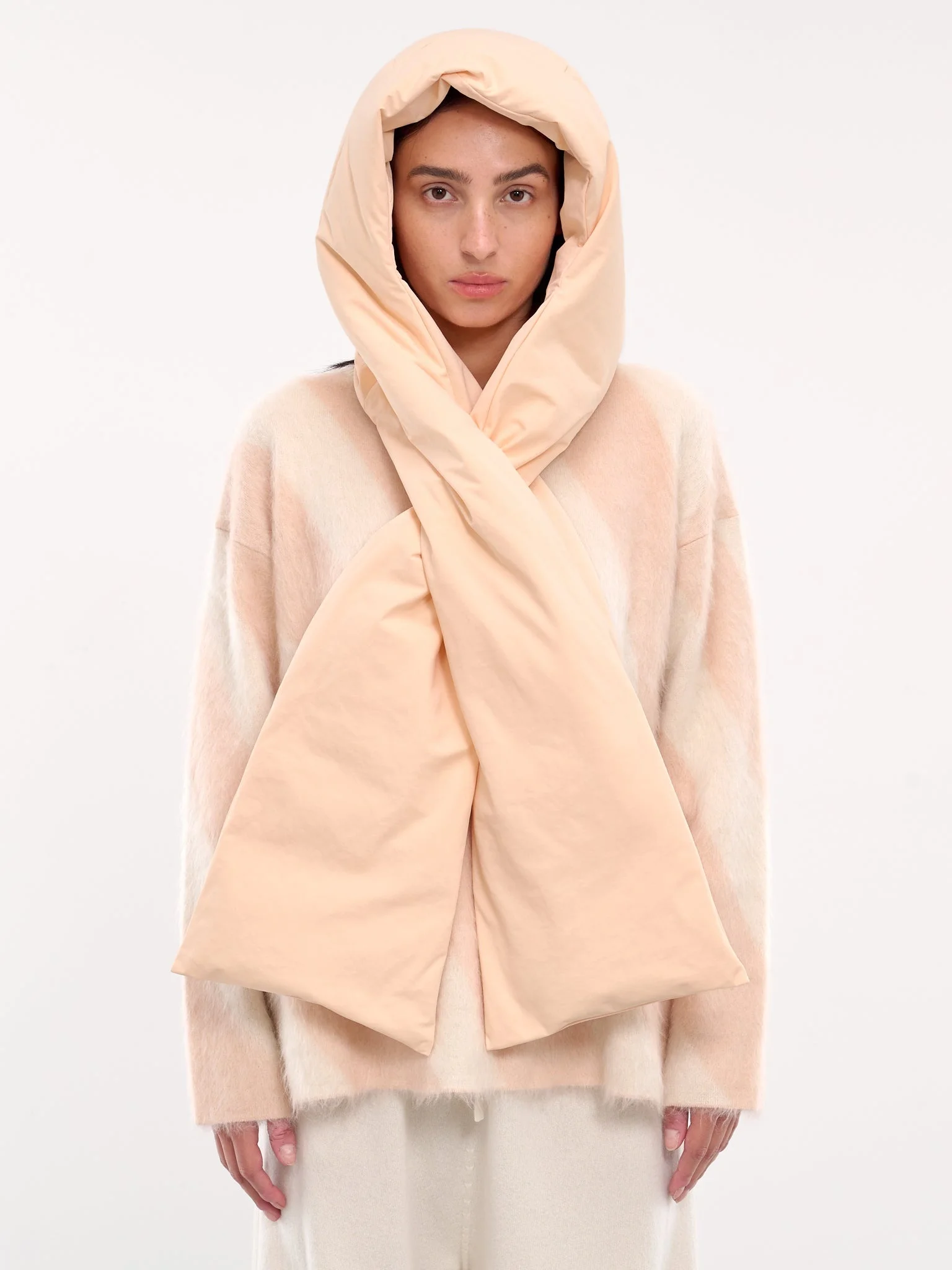 JIL SANDER scarf in peach, scarf hood design, paneled construction, padded, hood, wide scarf, fitted. Made in Italy One Size Model is 5'6" wearing size OS. Bust: 31" Waist: 24" Hips: 34"