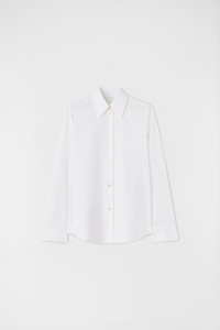 Long-sleeved cotton shirt with pointed collar and rounded hem Details - slim fit and straight cut - pointed collar - one-button stand collar and classic yoke - front button closure - one-pleat sleeves and one-button cuffs - organic cotton poplin - 100% cotton - made in Italy - StyleID: J04DL0003J45001100 Care - dry clean only - iron with care Fit - model is 177cm/5'9" and is wearing a size 34 DE - Please note that the physical label of the item will show the German size