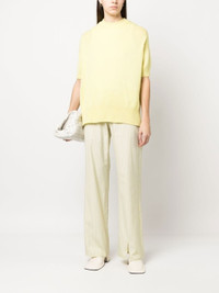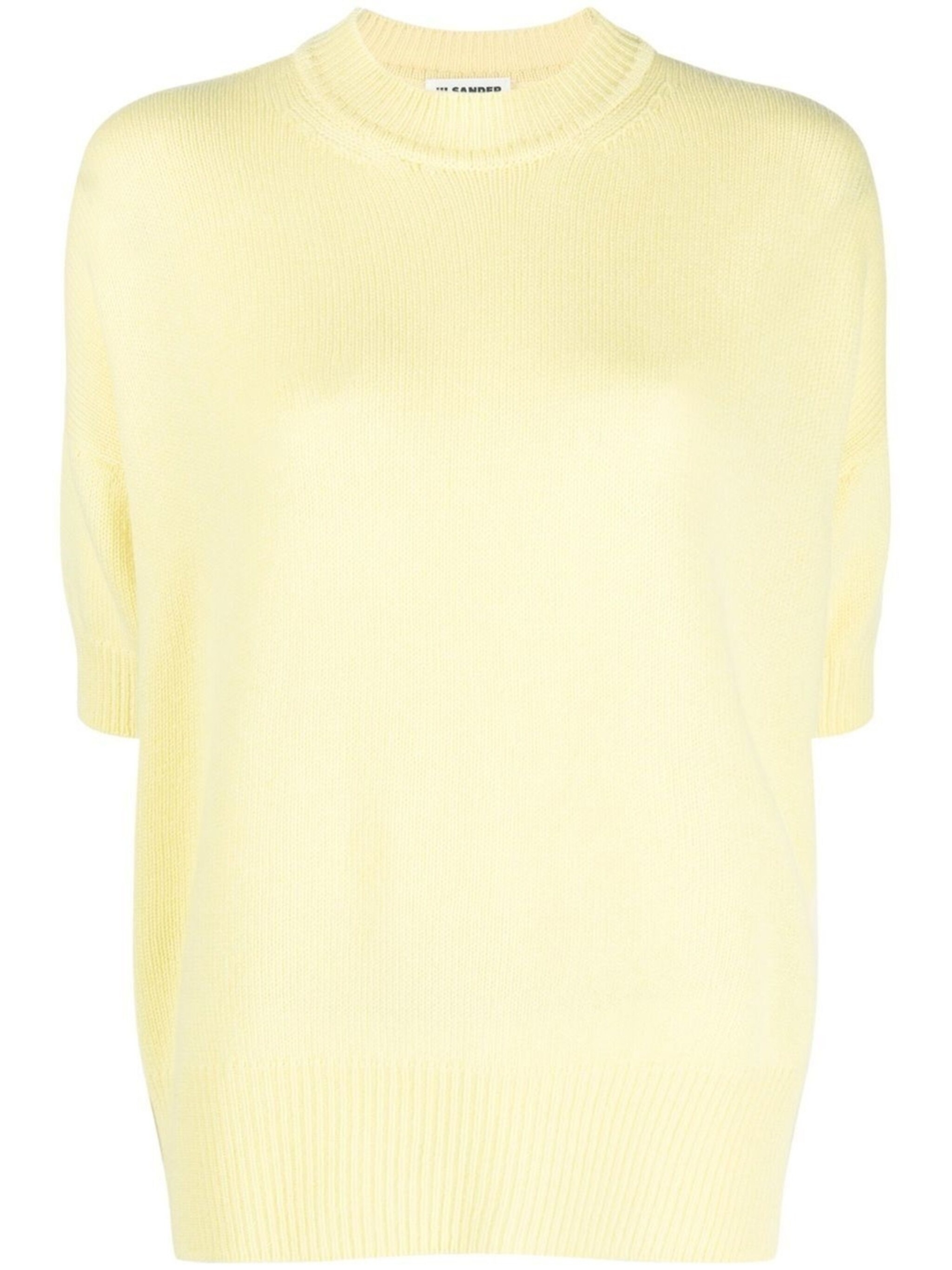 short-sleeve cashmere top from JIL SANDER featuring pastel yellow, cashmere, knitted construction, ribbed-knit edge, crew neck, short sleeves and straight hem. Size & Fit Model Measurements: Height: 1.73 m Bust/Chest: 85.0 cm Hips: 93.0 cm Waist: 63.0 cm Model wears size XS Fabric and Care Designer Style ID: J02GP0014J13206 Designer Colour: 742 LIGHT PASTEL YELLOW Composition: Cashmere 100% Washing instructions: Dry Clean Only Made in Italy
