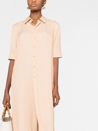 short-sleeve midi shirtdress Jil Sander's minimalist aesthetic is showcased with this classic shirt dress, imagined in a neutral colourway for SS23. The short-sleeve design is cut to a midi length for a timeless feel. Made in Italy Composition Viscose 100% SIZE & FIT Model measurements Height 5 ft 10 in(1.77 m) Bust/Chest 32.28 in(82 cm) Hips 34.25 in(87 cm) Waist 24.01 in(61 cm) FittingInformation Designed to be unstructured, offering a loose fit throughout Made from a midweight non-stretch fabric This piece fits true to size – take your usual size Washing instructions Dry Clean Only