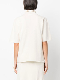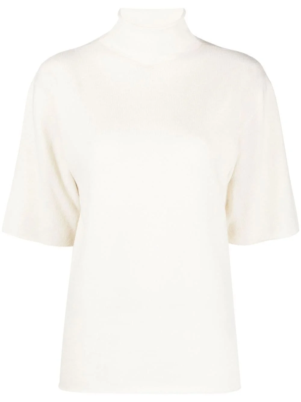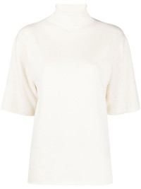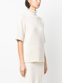 short-sleeved roll-neck knitted top light beige cashmere knitted construction tonal design roll neck drop shoulder short sleeves lettuce hem Made in Italy Composition Cashmere 100% SIZE & FIT Model measurements Height 5 ft 11 in(1.8 m) Bust/Chest 31.49 in(80 cm) Hips 35.43 in(90 cm) Waist 24.4 in(62 cm) FittingInformation This piece fits true to size. We recommend you get your regular size Cut for a loose fit Made with a mid-weight fabric