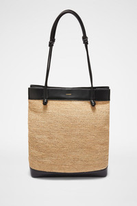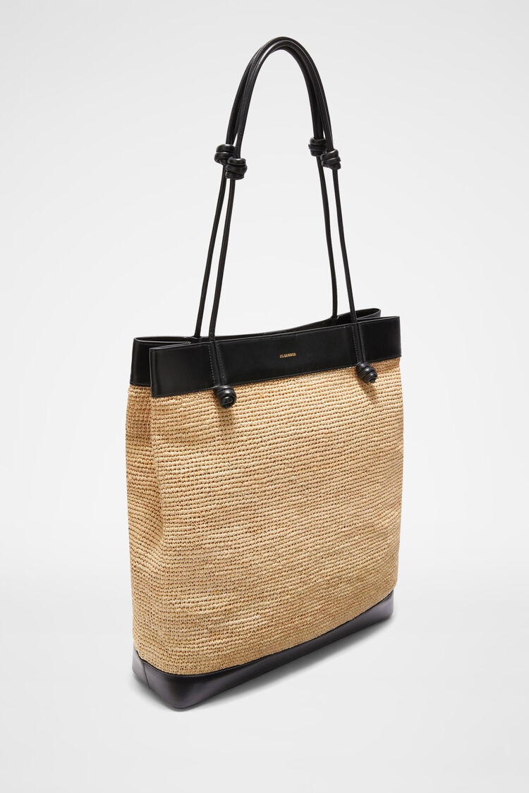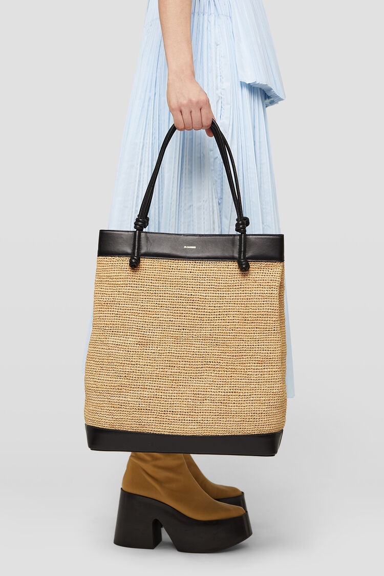 Raffia shopper bag with leather handles and embossed Jil Sander logo
