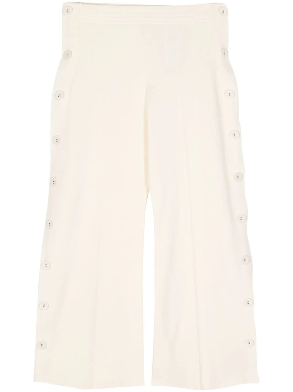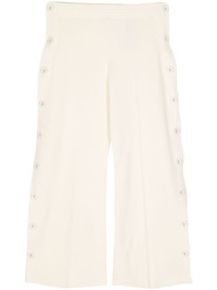 side-button straight-leg trousers Highlights - Off-white - Cotton blend - High-waisted - Side button fastening - Straight leg Made in Italy Composition Cotton 95%, Polyamide 4%, Nylon 1% SIZE & FIT Measurement BACK RISE 13.38 in(34 cm) FRONT RISE 12.2 in(31 cm) HIPS 37 in(94 cm) INSIDE LEG 29.13 in(74 cm) Outside Leg 40.55 in(103 cm) WAIST 27.55 in(70 cm)